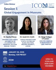 ICOM Canada invites museum professionals, academics, students, and cultural practitioners to participate in a new five-part webinar series, Shaping Museums for a Connected World, taking place weekly from January to February 2026. Open to both ICOM members and non-members, this online training series explores how museums of all sizes and types can build meaningful international connections, navigate global challenges, and strengthen their capacity for impactful cross-border work.